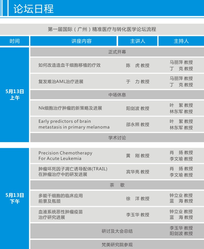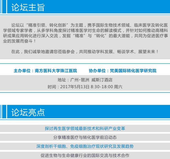 ![]() 2015年奥巴马提出的精准医学推动了整个了个体化医学的发展,所谓的精准医疗本质上是个体化医学体系。在这个体系中,基因测序是一个重要的前提条件,而干细胞则是精准医疗的绝佳载体。干细胞凭借其特性,通过自体细胞增殖或组织器官再生达到治疗目的,简而言之就是一种精准的个体化自体治愈过程。而另一层面,由于不同部位和用途的干细胞产品,能够精准到达受损部位或组织器官,可以成为靶向治疗药物的载体,精确到达病变部位。 随着干细胞技术和生物材料科技的发展,再生医学成为国际生物学和医学界备受关注的研究领域,成为继药物治疗、手术治疗之后的第三种疾病治疗途径。目前,干细胞与再生医学正处于重大科学技术革命性突破的前夜。 主办单位:南方医科大学珠江医院 协办单位:梵美国际转化医学研究院 时间:2017 年 5 月 13 日 8:30 ~ 18:00(周六) 地址:广州·琶洲 威斯汀酒店 论坛亮点 1. 探讨再生医学领域最新技术和科研产业变革 2. 分享精准医疗与转化医学前沿动态 3. 深度剖析干细胞、免疫细胞治疗现状研究及发展趋势 4. 促进生物与生命健康行业的国际交流与技术合作 一、受邀嘉宾:国内外顶级专家教授 陈虎 ※中国人民解放军307医院 造血干细胞移植科主任 ※全军造血干细胞研究所所长 ※军事医学科学院细胞与基因治疗中心主任 ※造血干细胞治疗与转化研究北京市重点实验室主任 于力 ※中国人民解放军总医院 血液病中心主任 ※全军血液学专业委员会主任委员 ※中国研究型医院学会血液病精准诊疗专业委员会主任委员 阳剑波 ※美国明尼苏达大学 实验医学与病理系教授 ※Masonic癌症研究中心 高级研究员 ※中南大学客座教授 ※梵美国际转化医学研究院 首席科学家 邵永照 ※美国统计协会 院士 ※美国纽约大学医学院 医学院生物统计学终身教授 ※美国国立卫生研究院 评议组成员 黄刚 ※美国俄亥俄州辛辛那提儿童医院 血液疾病与肿瘤研究中心教授 ※美国血液病协会 会员 ※国际骨髓增生异常综合征协会 会员 宾亮华 ※美国国立犹太健康中心 儿科系研究员 ※暨南大学生物医学转化研究院 教授 徐洋 ※美国加州大学圣地亚哥分校生命科学院 教授 ※南方医科大学肿瘤研究所 所长 ※863再生医学 首席专家 李玉华 ※南方医科大学珠江医院 血液科主任 ※中国研究型医院学会血液病精准诊疗专业委员会 委员 ※广东省医师协会血液学分会 副主任委员 ※广东省免疫学会临床免疫学专业委员会 副主任委员 ※科技部人类遗传资源管理专家 ![]() ![]() ![]()